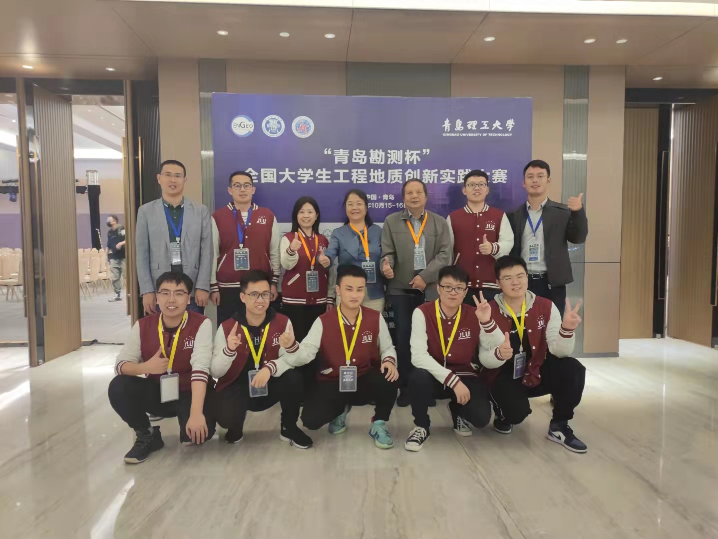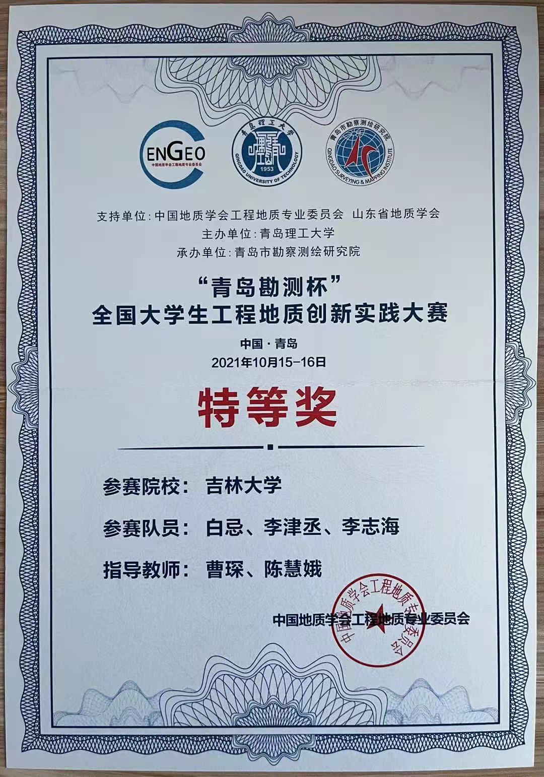 On October 15, 2021, the First National Engineering Geology Innovation and Practice Competition for College Students was held in Qingdao. Two teams from the College of Construction Engineering (CCE) got through to the final. Finally, the team consisted of Bai Ji, Li Jincheng and Li Zhihai, jointly mentored by Cao Chen and Chen Hui'e, won the outstanding prize; and the team consisted of Luo Yonggui, Lei Haomin and Li Yuchao, jointly mentored by Song Shengyuan and Xu Xin, won the second prize.