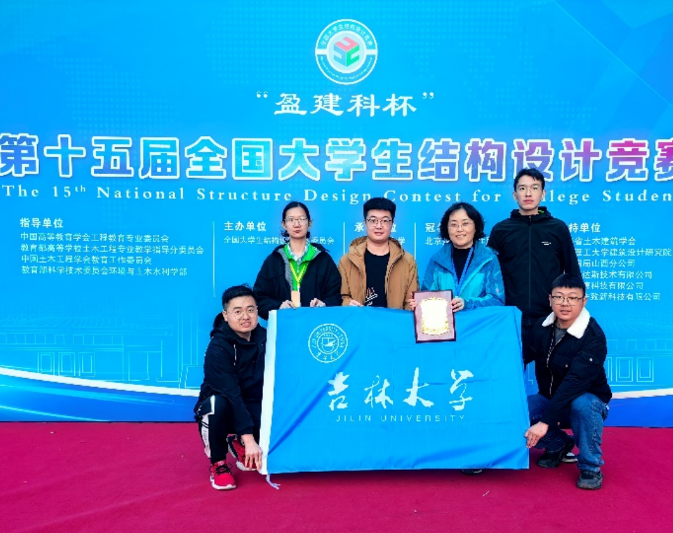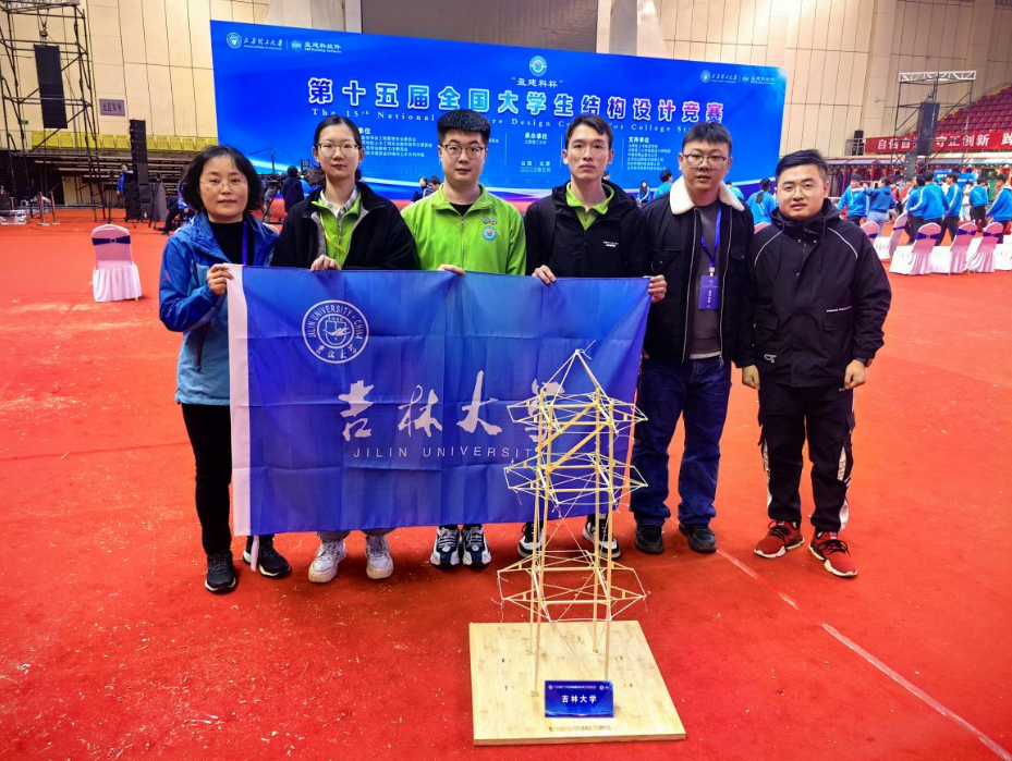 The team from the College of Construction Engineering at Jilin University, led by Zhu Shan, Head of the Department of Architectural Engineering, competed under the dedicated guidance of instructors Zhu Shan and Zheng Shaopeng. The undergraduate students Yan Xinyi, Xiang Shuanglin, and Sun Zhongyu worked together and, after 16 hours of on-site construction, successfully completed a wooden pagoda that withstood three full loads, ultimately winning the National Second Prize. Another team consisting of Zhu Yangguang, Fang Shule, and Liu Enbo received the National Third Prize.