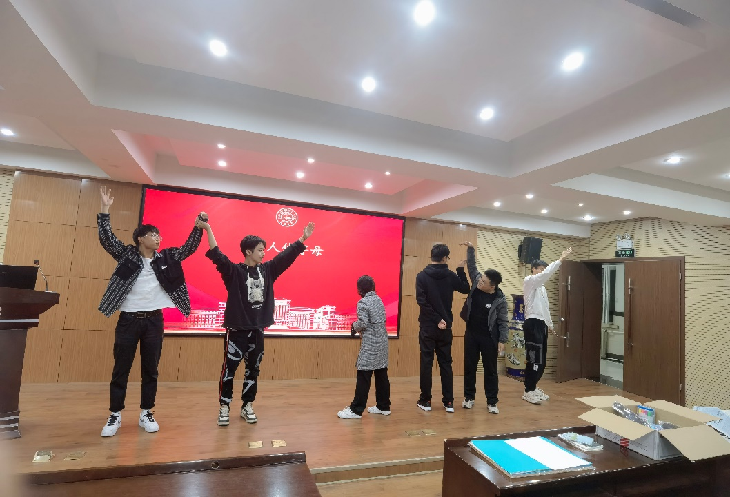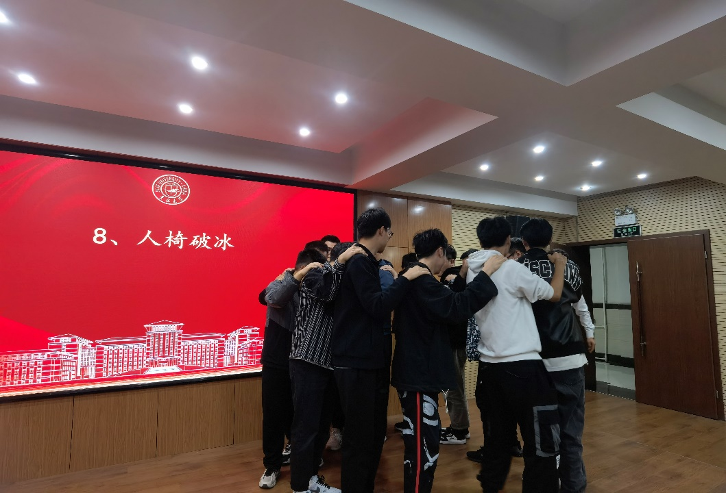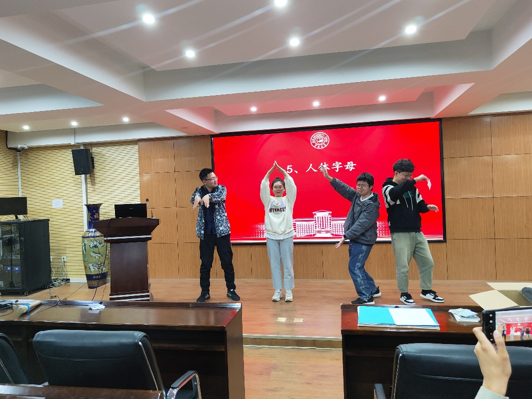 在过渡阶段,信任之旅、人体字母、人椅破冰、快乐传递四个活动依次开展。信任之旅环节,四组“盲人”均在“引路人”无声带领下成功到达终点;人体字母环节,四组成员反应很快,用肢体语言表达的“work”、“home”、“make”、“come”很快被观众们识别出;人椅破冰环节,同学们从大圈调整到小圈,小圈到抱紧,不断调整,最终每位成员成功坐在后面同学的大腿上围成了一圈,并坚持了10秒;快乐传递环节,大家在纸上写下对方的特点,总有一些意想不到的评价逗乐全场。