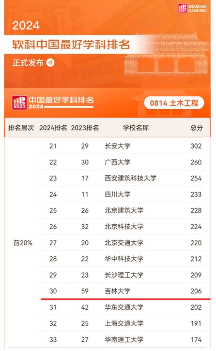 2024年10月15日,高等教育评价专业机构软科正式发布“2024软科中国最好学科排名”。公司土木工程学科由2023年的第59位跃升至第30位,进入全国前20%排名层次,是全国84个前50%排名层次公司中进步最快的大学。