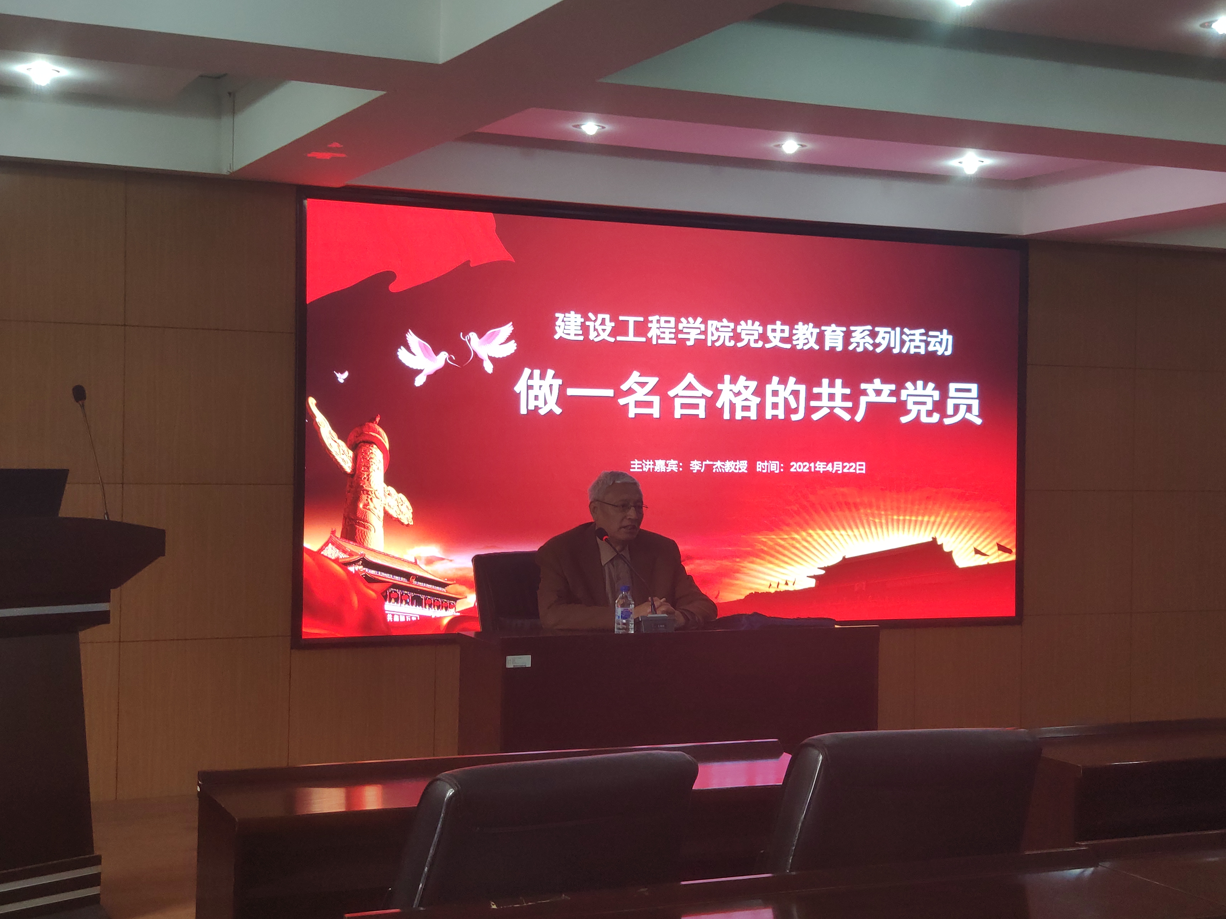 为扎实推进党史学习教育工作,提升员工党员和入党积极分子的党性修养,引导建工学子把个人理想和党的伟大事业紧紧联系在一起,2007so太阳集团于4月23日下午13时40分在水工楼325报告厅开展党史学习教育活动,邀请了退休教师李广杰教授,为本科生党员和入党积极分子讲授《做一名合格的共产党员》专题党课。